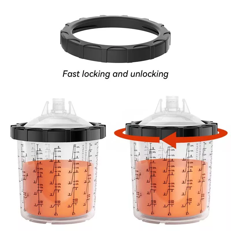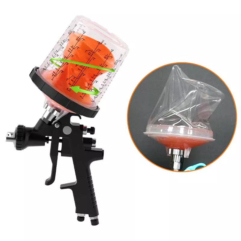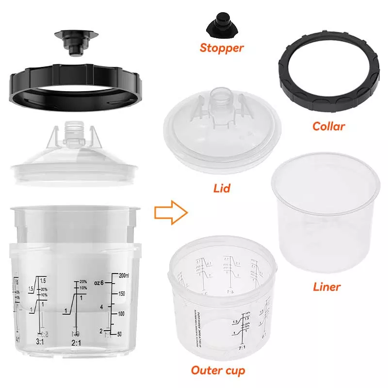 Овој систем за чаши за боја за еднократна употреба 200ML 1.0 во основа ја заменува традиционалната чаша за напојување на гравитацијата бидејќи не само што заштедува повеќе боја, туку и ја подобрува ефикасноста на бојадисувањето. Поточно, извонредниот дизајн на автоматското спирално спуштање на поставата при сликање ја прави бојата целосно искористена; во меѓувреме, дизајнот за брзо заклучување и замена на облогата го избегнува миењето на чашата, овозможувајќи ефикасно и повеќекратно извршување на боењето. Имаме адаптери за речиси сите марки пиштоли за прскање на пазарот за да ги задоволиме потребите за искуство на различни ентузијасти за пиштоли за прскање. Адаптерот е изработен од нерѓосувачки челик, кој е отпорен на корозија на бојата и многу издржлив. Тесната комбинација на облогата со капакот осигурува дека системот за чаши не пропушта боја додека бојадисува и поддржува долгорочно складирање на неискористената боја за да се избегне отпад.