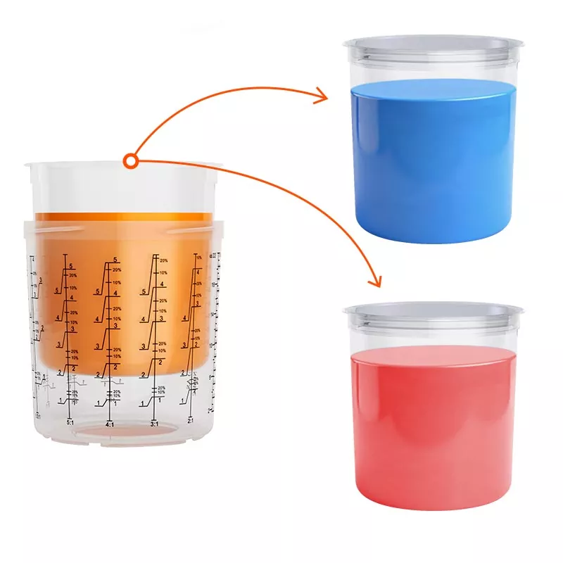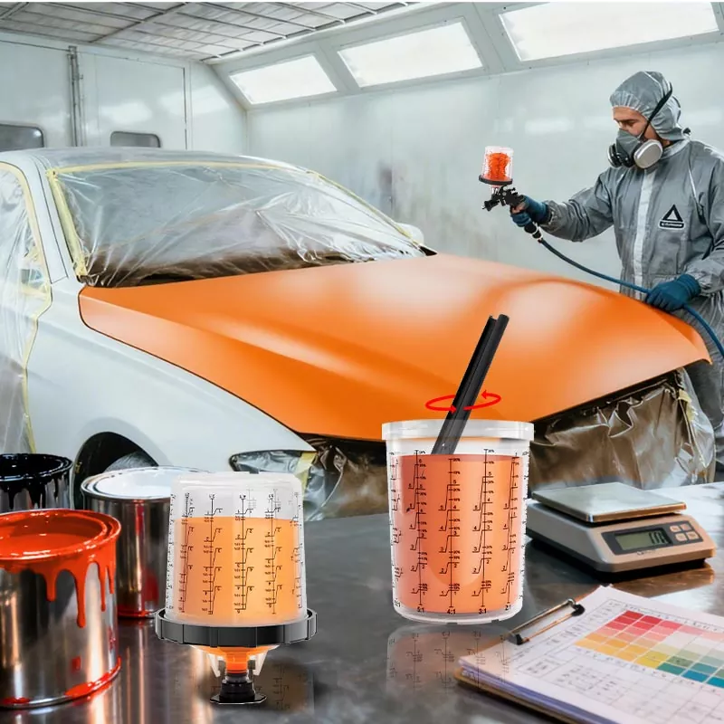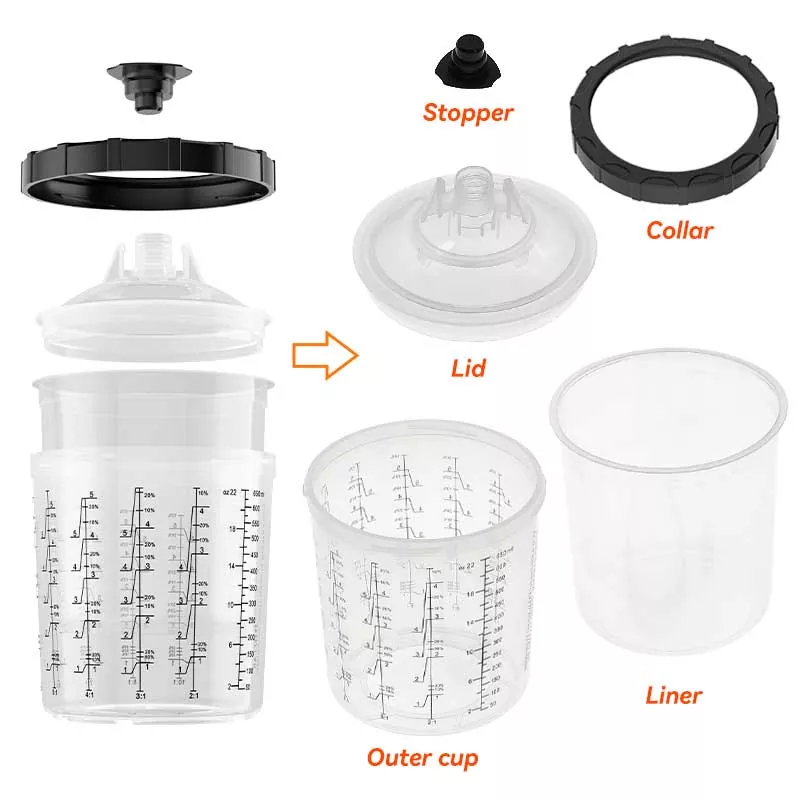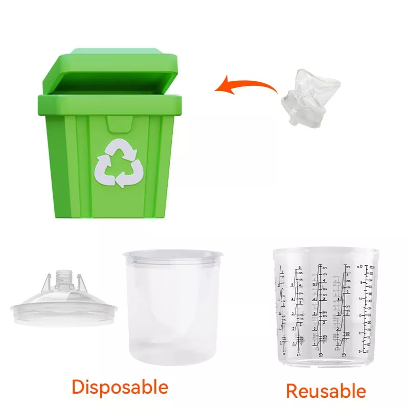 Систем за чаши за еднократна употреба на боја Комбинирајте ги функциите за мешање, филтрирање, прскање и складирање во една единица. Ова не само што ја поедноставува подготовката пред боја, туку ги зачувува и трошоците за мешање чаши и хартиени инки, што ги прави совршен избор за заштеда на време на подготовка и подобрување на ефикасноста на прскање.