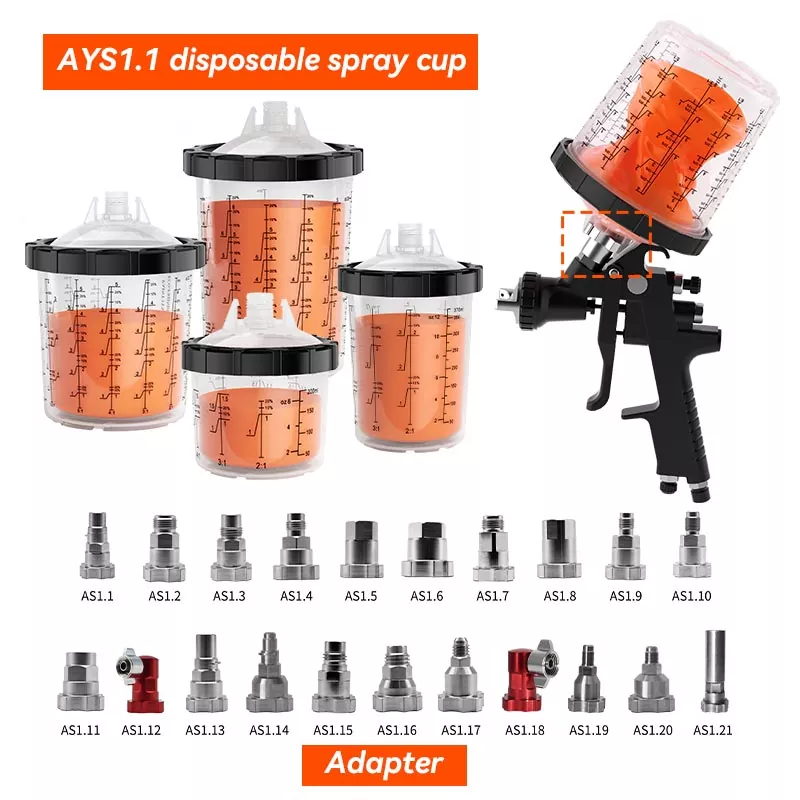 Купот за спреј за еднократна употреба AYS1.1 е компатибилна со адаптерот за серии PPS1.0. Со адаптерот, може да биде совршено прилагодено на која било марка на пиштол за спреј и може да се користи во која било позиција без ризик од капење на боја.