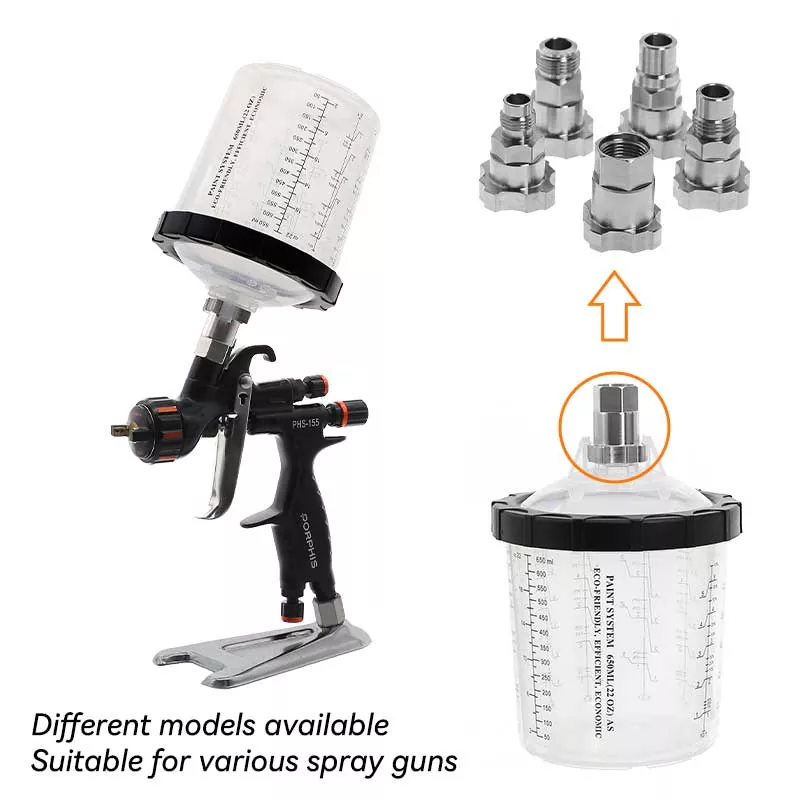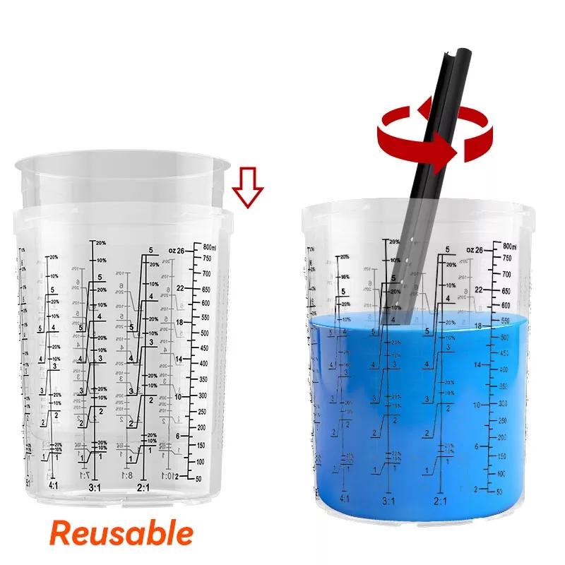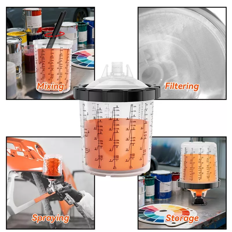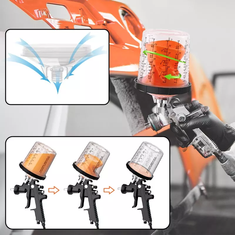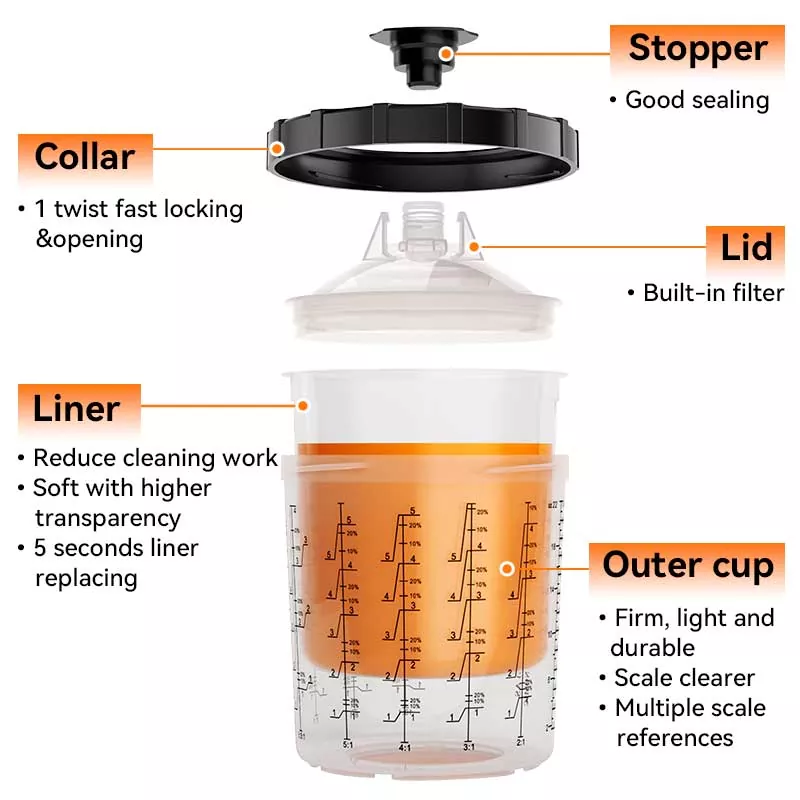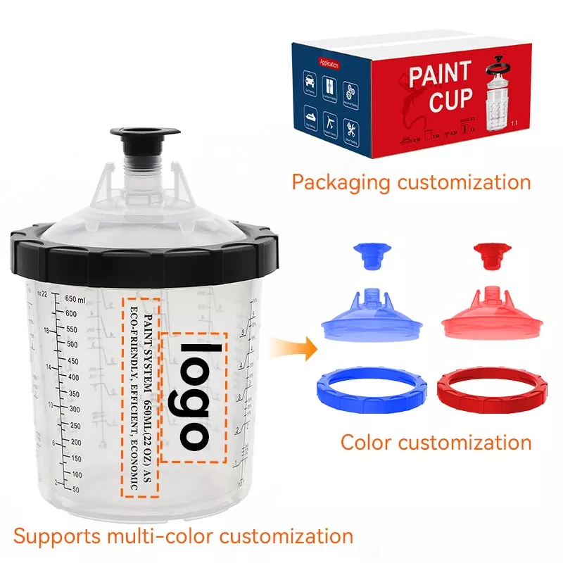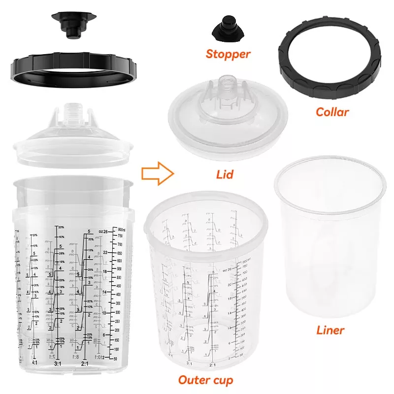 Системот за чаши за боја за еднократна употреба 800ML 1.0 го прави мешањето и прскањето на бојата лесно и практично, а истовремено го поедноставува чистењето и складирањето на бојата. Нема повеќе префрлање производи во посебни контејнери - едноставно користетевнатрешни чаши за еднократна употребаза мешање, прскање и складирање на различни бои одвоено, елиминирајќи го прскањето на бојата. Растворот за чаши за прскање AYSPAT за еднократна употреба е дизајниран за чести промени на бојата, намалувајќи го времето на чистење и употребата на растворувачи.