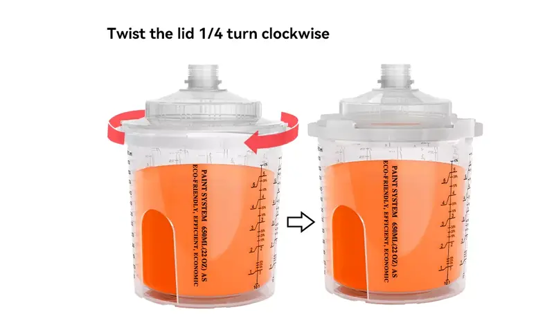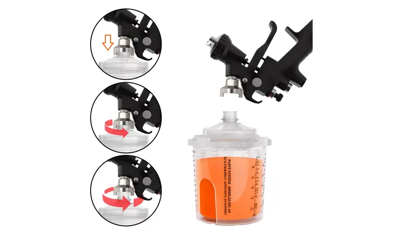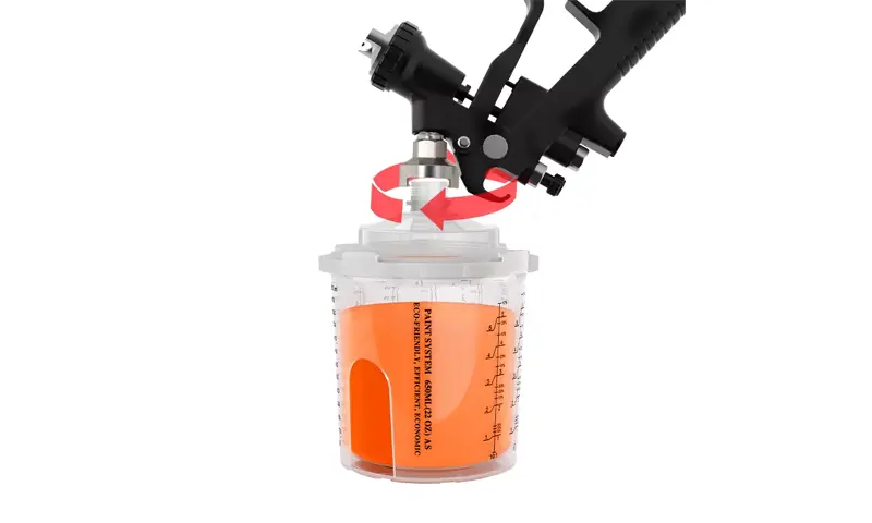Прикачете го пиштолот за спреј на и спреј пиштол чаша заклучете го на место