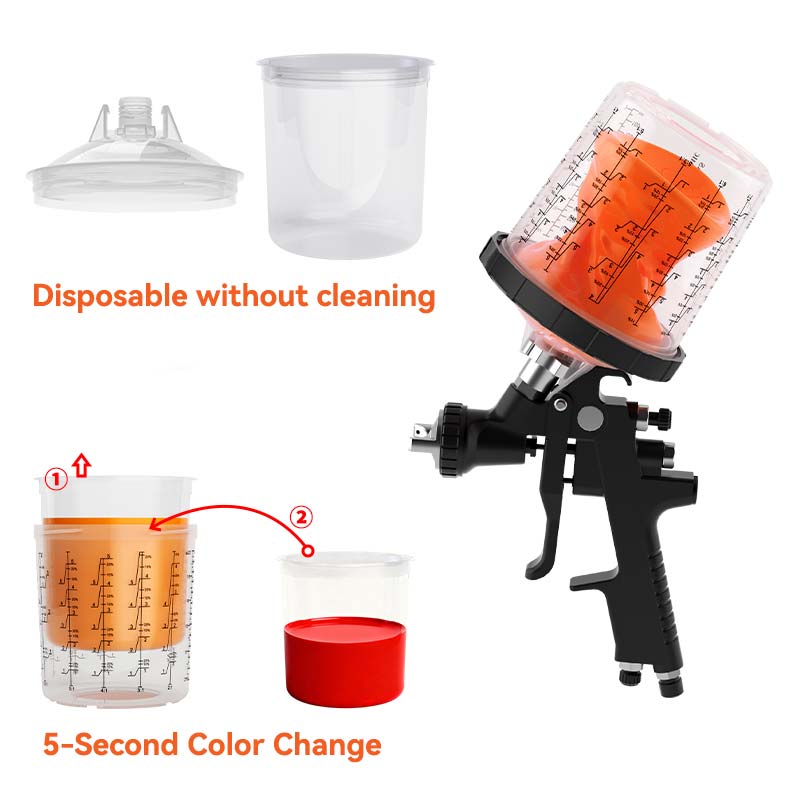 Начаша за еднократна употреба пиштол за прскање не бара чистење по употреба; едноставно отфрлете ја внатрешната чаша за брзо менување на боите, намалувајќи го интервалот за промена на бојата од 20 минути на 5 секунди, ефективно двојно зголемување на дневното производство. Капакот има вграден фин филтер за ефикасно филтрирање на нечистотиите, обезбедувајќи еднообразно и мазно прскање, што резултира со поквалитетна завршница.