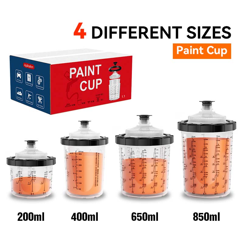 Врз основа на истражувањето на пазарот, чашата за бои е достапна во четири спецификации на капацитетите: 200ml, 400ml, 650ml и 850ml, угостителство на различни сценарија за употреба, без разлика дали е за прскање со големи области или детални допири. Покрај тоа, структурата на внатрешната чаша е оптимизирана за да се обезбеди непречен проток на боја, намалување на затнувањето и отпадот.